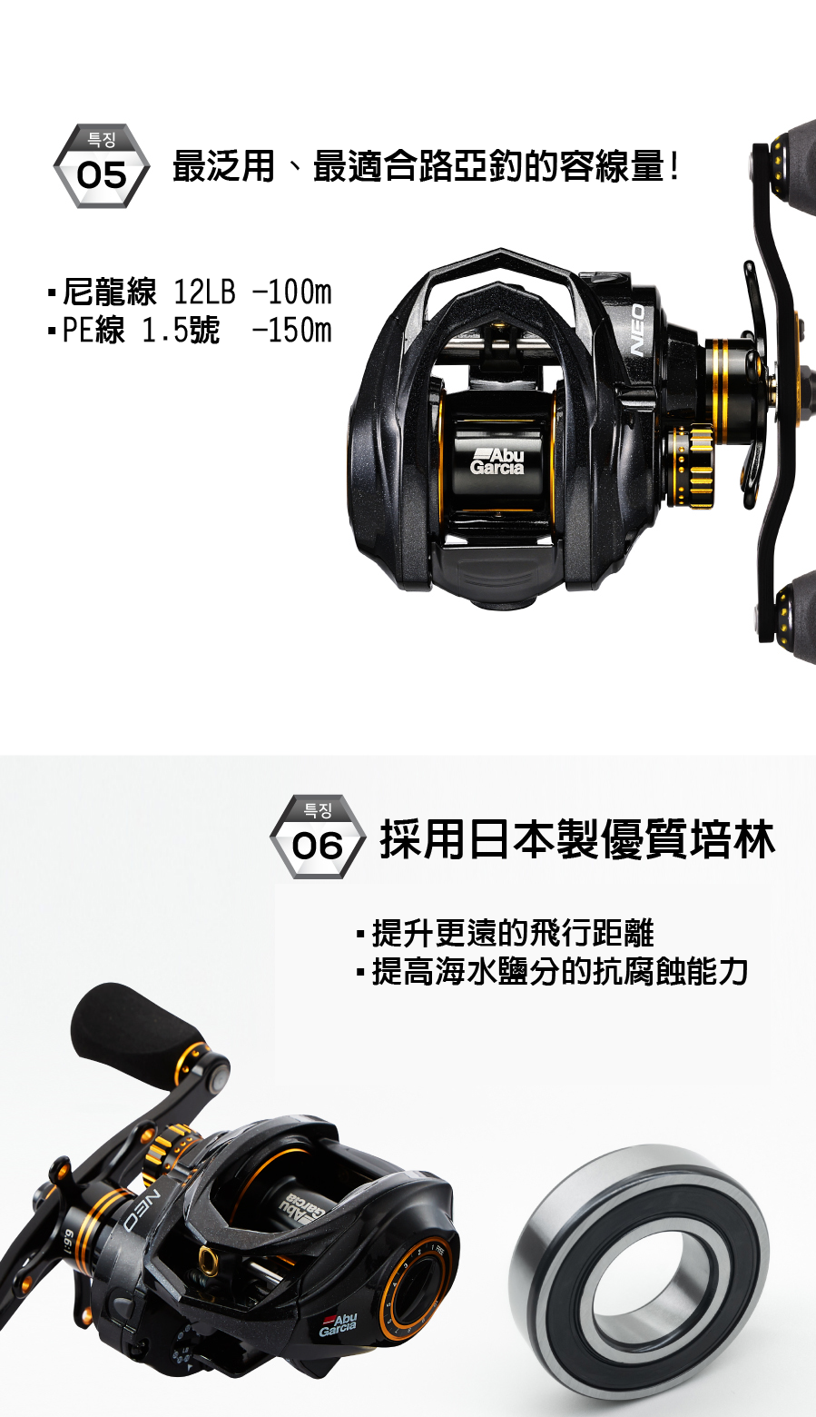 ●6顆日製超遠投不鏽鋼培林6+1顆防逆轉培林。