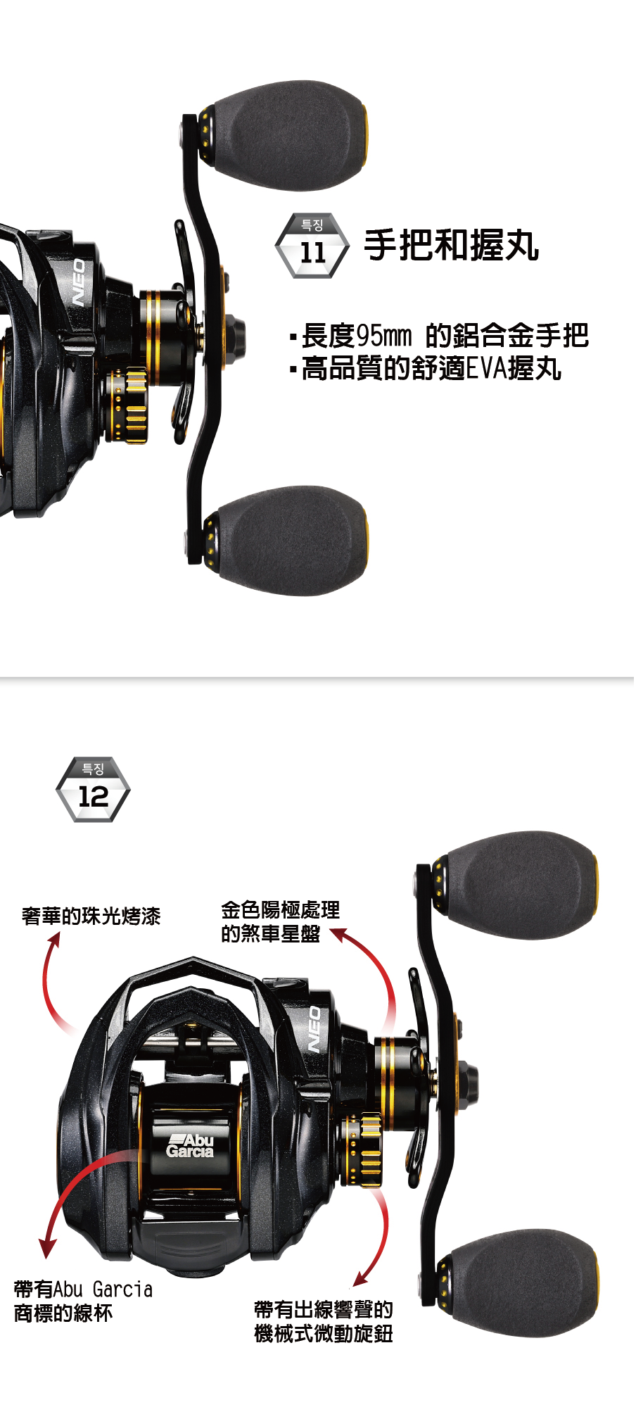 ●長度95mm、厚度4mm的曲型鋁合金手把,與EVA握丸。