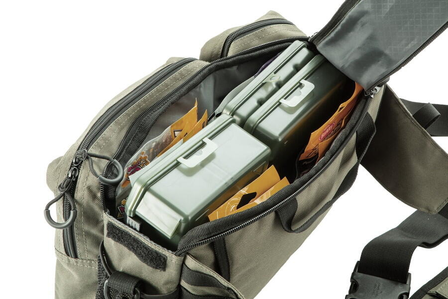 The front pocket (small) can hold small cases such as Abu hook & sinker case L (VS-318SD), Abu lure case, and light game case (SFC-LF, SFC-FF).