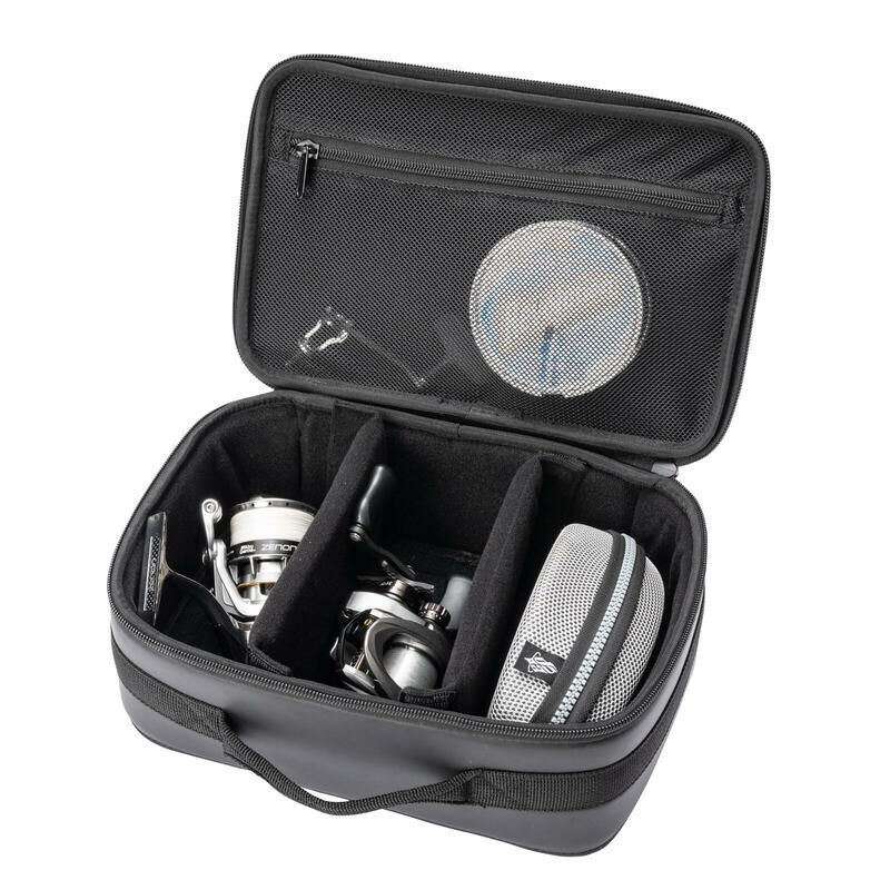 A semi-hard reel case with cushion padding that protects reels and other supplies from shock during transport and dirt during storage!