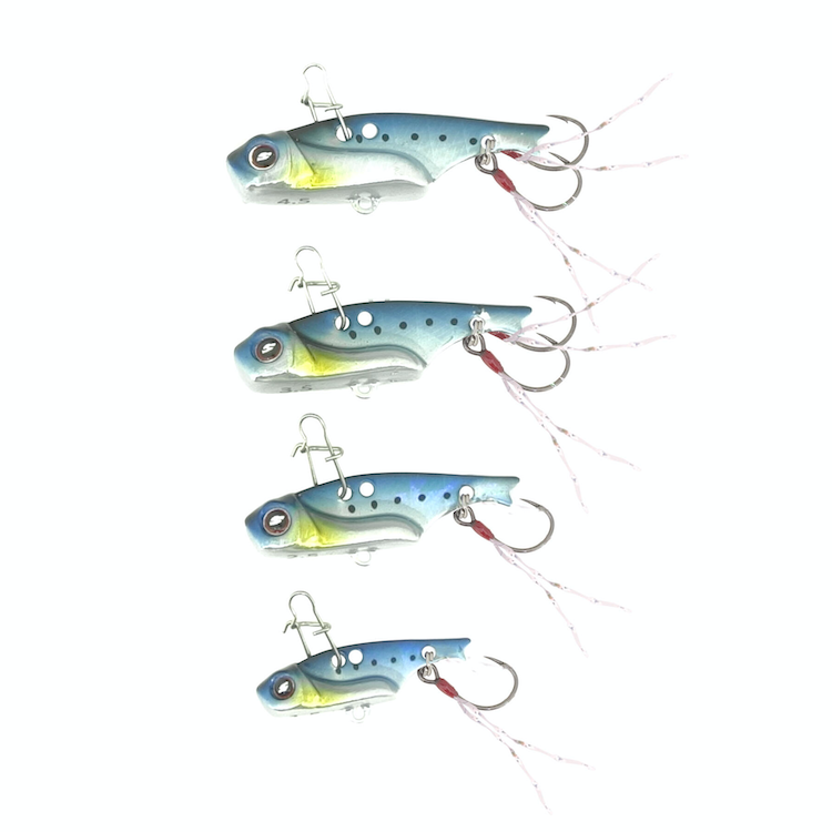 The 1.5g and 2.5g lures use one hook to give priority to the pull feeling, while the 3.5g and 4.5g lures use two hooks to emphasize the hooking performance.