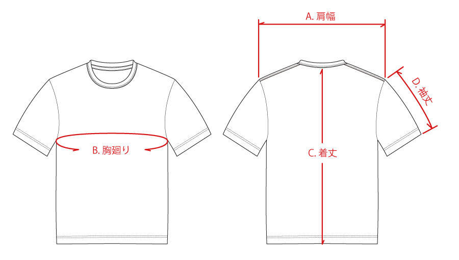 Size A.肩幅 B.胸廻り C.着丈 D.袖丈