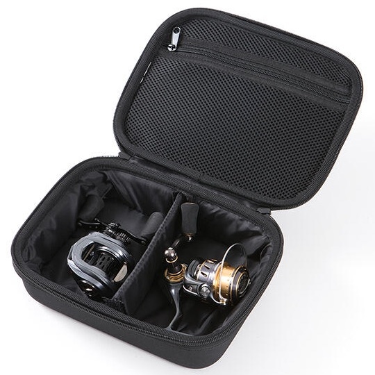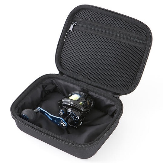 內襯緩衝材質及半硬的外殼,  保護珍貴的器材或是捲線器, 可以放置一般尺寸的小烏龜, 或是小型紡車捲線器二個, 如要放大把手的雙軸捲線器, 將隔板取下即可放置, 上蓋的內部有網眼設計的儲存設計