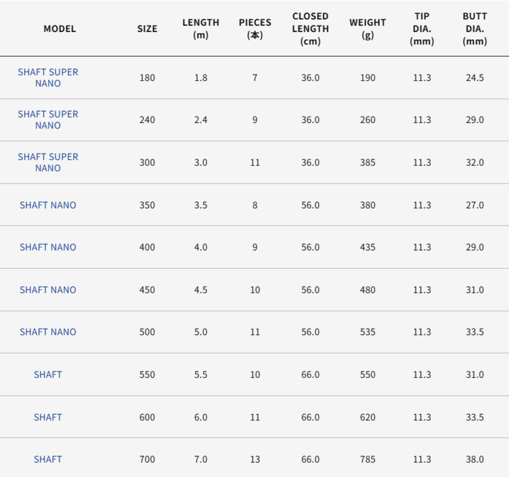 The extremely compact LANDING GEAR SHAFT SUPER NANO models, with a collapsed length of 36cm, are perfect for bank fishing for bass as well as for use on small boats.