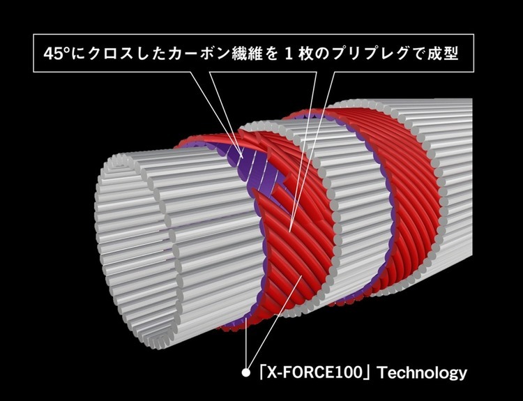 Conventionally, increasing rod strength required layering multiple prepregs with carbon fibers oriented in different directions. In contrast, X-FORCE100 forms a single prepreg sheet using carbon fibers crossed at 45 degrees, an orientation highly resistant to torsional stress.
