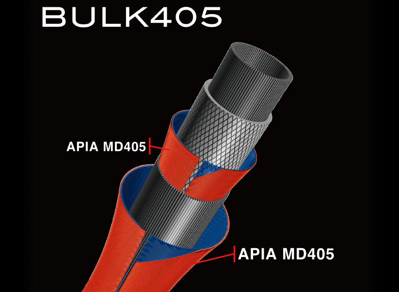 BULK405 是 APIA 獨家開發的高強度補強結構,將多方向預浸布(Prepreg)與 405 超級樹脂(Super Resin) 相結合,提升碳纖維密合度,實現無縫補強結構,大幅增強竿身整體剛性與耐久度。