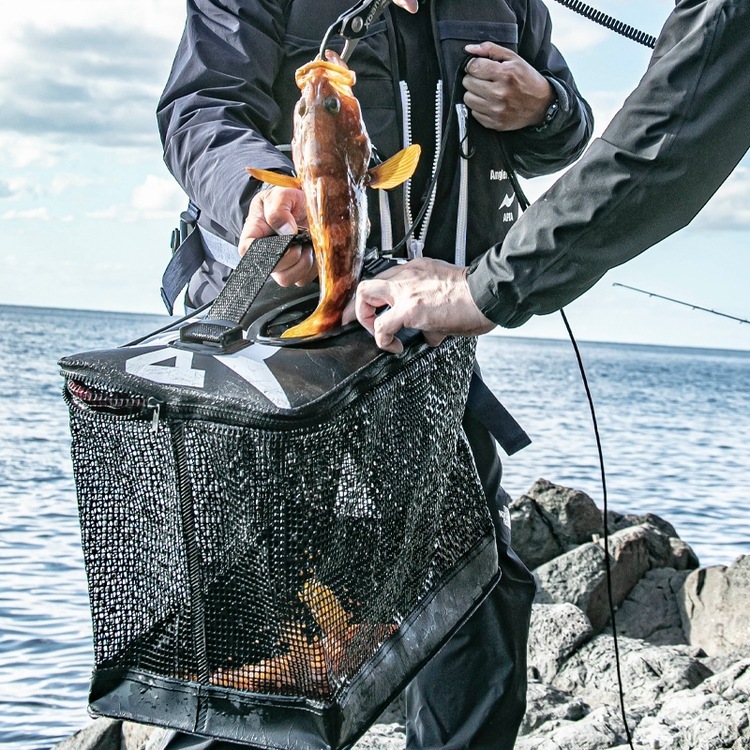 "I wish there was something like this..." This floating fish trap was born from a half-muttered tweet. You can see what makes it special at a glance. The window on the top lid opens and closes to let fish in and out without using a zipper. Of course, you can put fish in from the outside, but it can't be opened from the inside. This is a gimmick that is typical of APIA, and they have created a fish trap that was not available for saltwater fishing. The fish that you have caught in the net is held by the fish grip and then slips right in through the window. There is no hassle of opening the zipper...putting fish in...closing it...and you don't have to touch it with your bare hands, so the burden on the fish is minimal. It also helps to avoid the risk of accidentally releasing a fish that you have already put in. The gusset on the bottom allows you to move the fish with a little water still in it.
