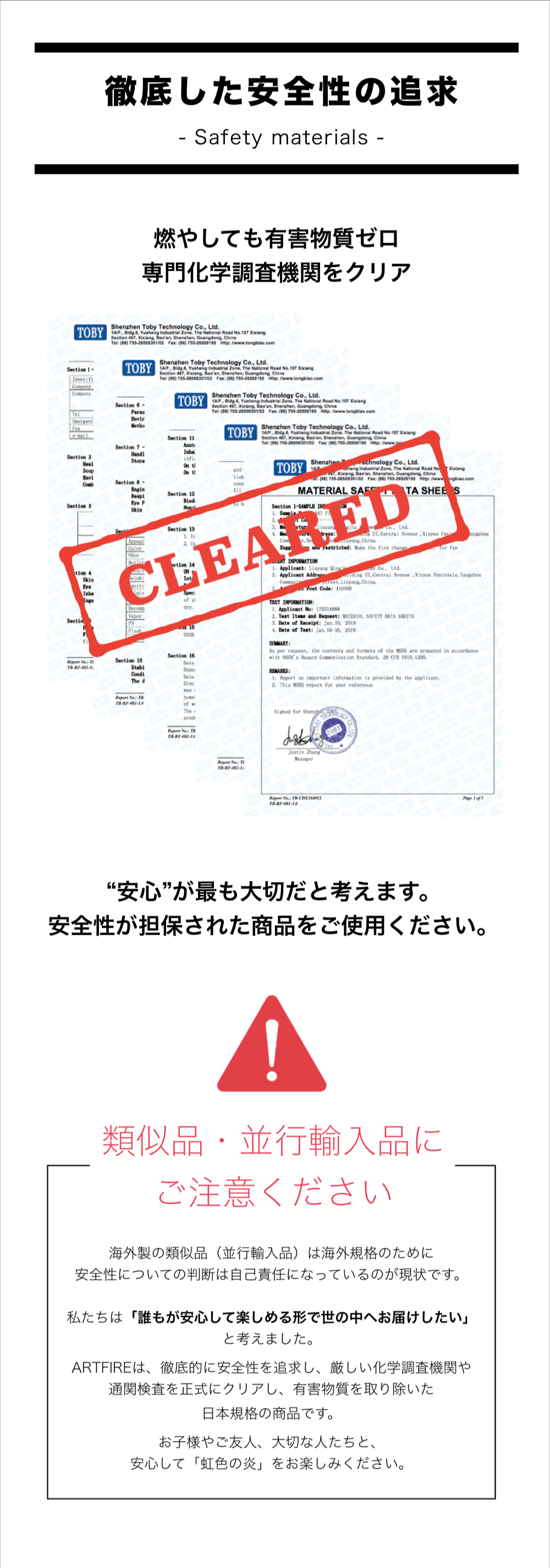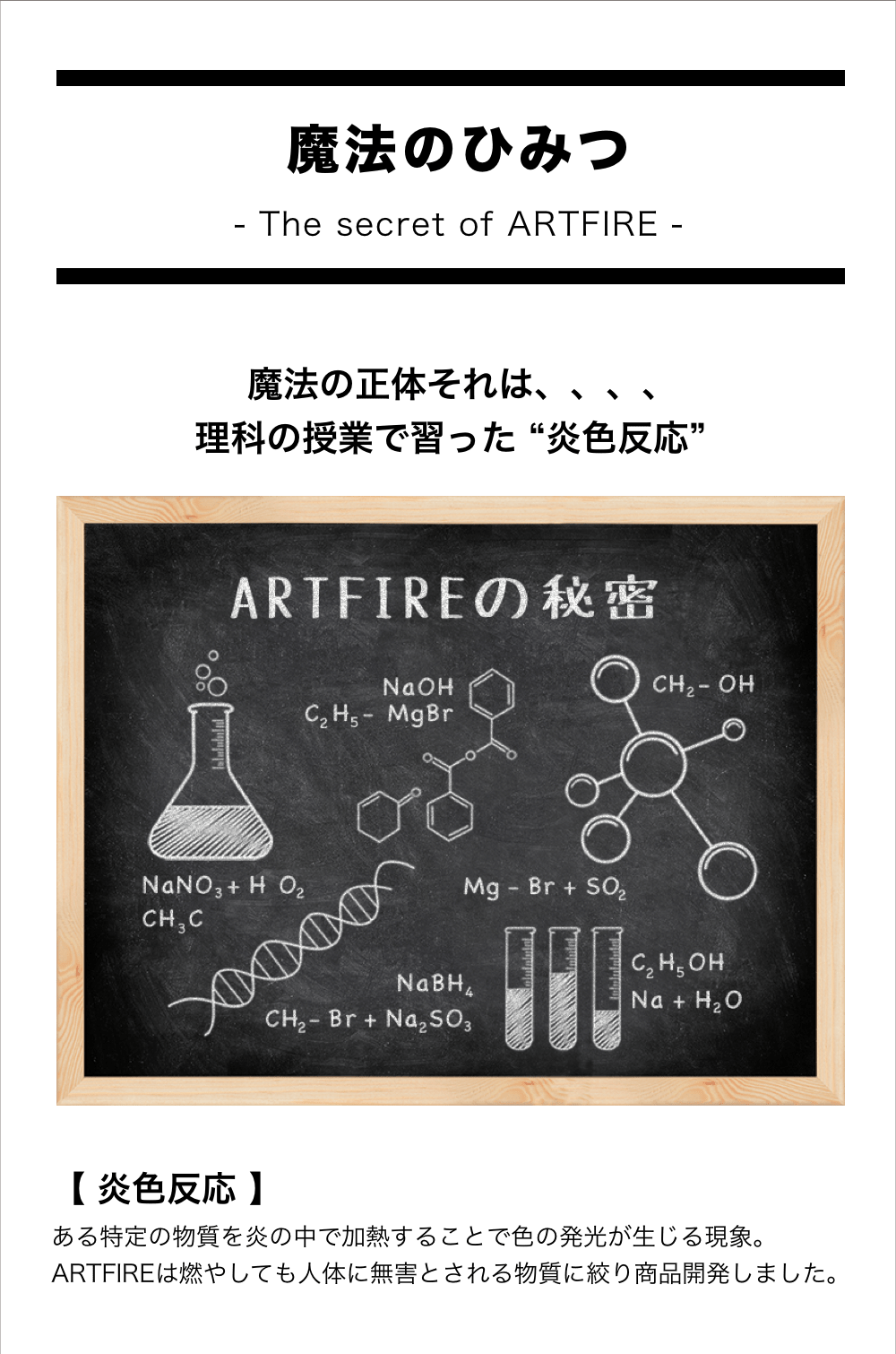 A phenomenon in which color emission occurs when a specific substance is heated in a flame. ARTFIRE has developed products focusing on substances that are harmless to the human body even if burned.