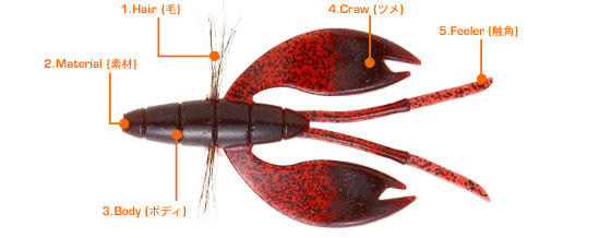 寬, 薄且長的觸角, 能很好反應竿先的動作, 輕微的水流也能優雅地搖擺, 會讓黑鱸不自主的咬一口, 雙螯有力的擺動混合觸角弱的波動, 這就是有效的吸引大黑鱸的秘訣