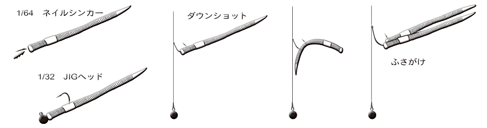 非常細小的針狀尾, 產生微波動, 無論是管理場或是野場都好用, 頭部體積比較大, 可以搭配1/32oz的汲頭鉤或是1/64oz的釘子配重(nail sinker), 用在倒吊釣組也很有效果