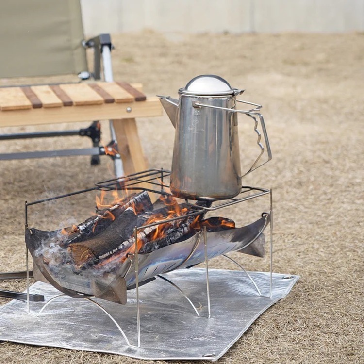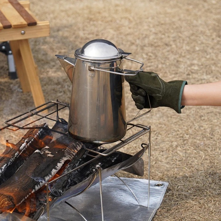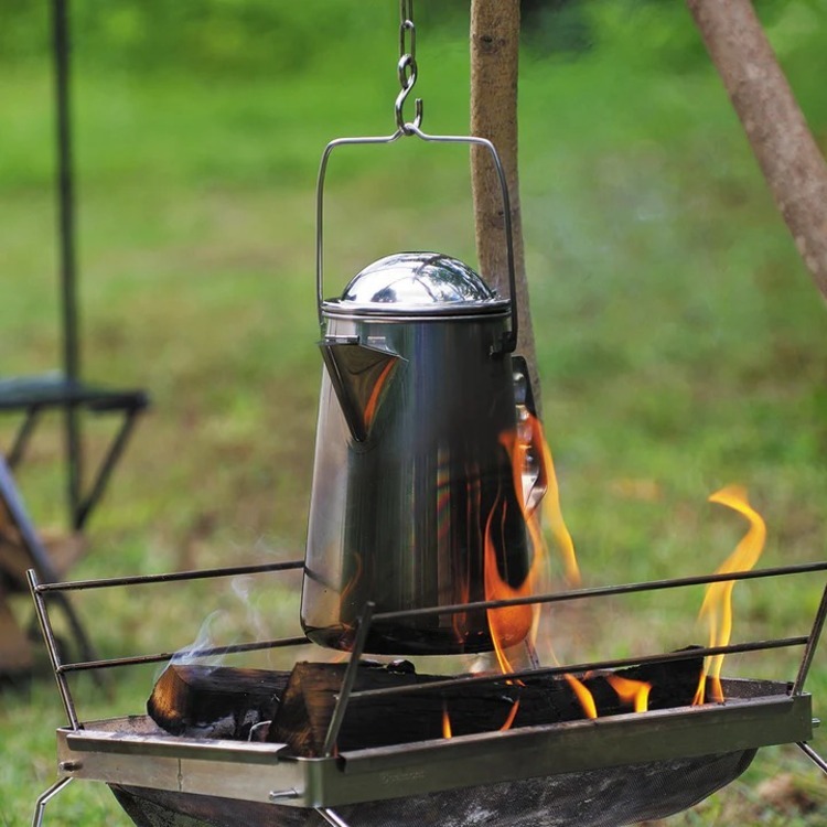The spout features a cover to prevent ash and debris from getting inside during campfire use; it automatically opens when pouring.