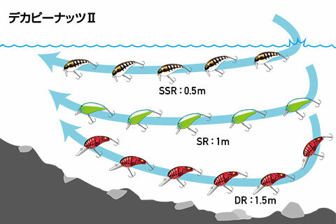 A deca-sized version of the national crankbait "Peanut II", which is widely used by bass pros and beginners all over Japan. The basic performance of "flying well, swimming well, easy-to-use crankbait" is the same as the original Peanuts II, but with a big body that is 10mm longer in length, the vibration, sound, and flight distance are boosted to strongly appeal to bass. It is possible to take a long productive zone by blowing it away and appeal to a wide range of bass. It has a good response from the start of retrieve, and it moves briskly with its wide wobbling and flashy rolling action, and when it contacts the cover, it surely invites a bite with its escape action. Versatile big crankbait that can attack around the cover without hesitation. A lineup of "SSR = Super Shallow Runner" up to 0.5m depth, "SR = Shallow Runner" up to 1m, and "DR = Deep Runner" up to 1.5m allows you to capture according to the depth of the water.