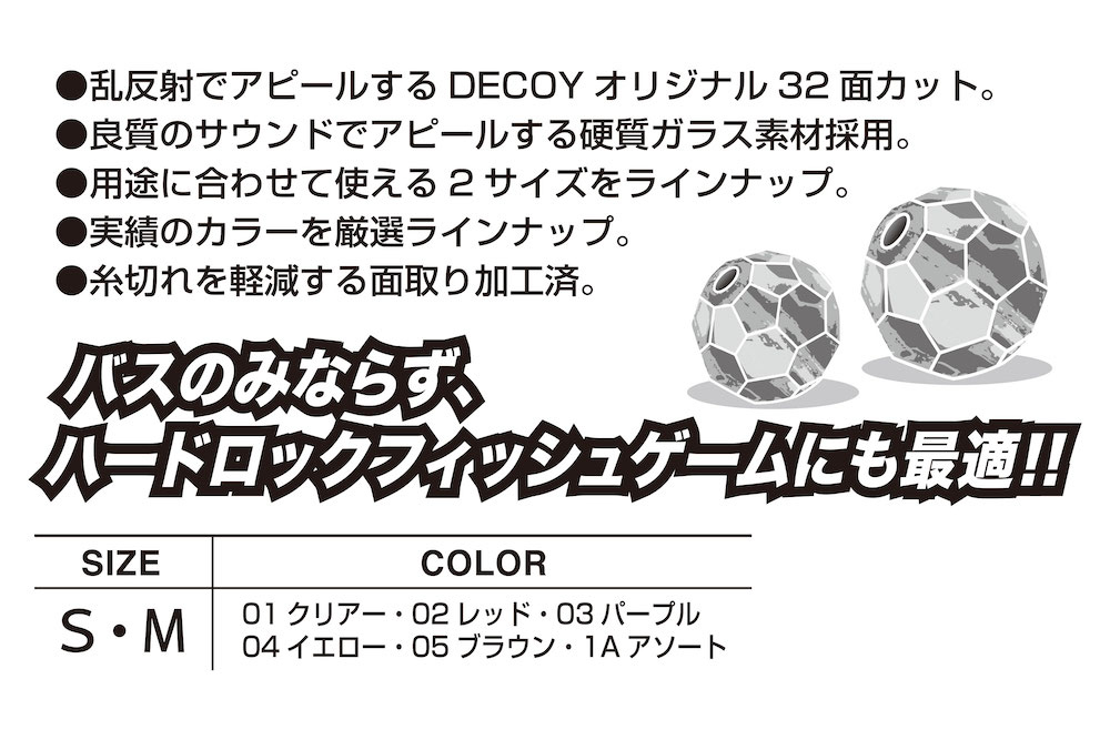 Multi-sided cut glass beads for Texas rig. Because of the hard glass material, the contact sound with the sinker appeals to the target with a ticking and good quality sound. Sometimes appeals to eating habits, sometimes invites reaction bytes.