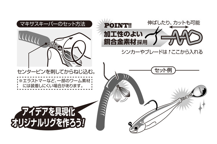 This is a worm keeper used in the "Makisashi Hook" series. If you attach it to your favorite vertical eye hook, it will exhibit high worm holding power. In addition to hooks, it is also possible to hang a sinker on a rig or attach a blade directly to a worm. It goes perfectly with worms and can be used in a variety of ways depending on your idea!