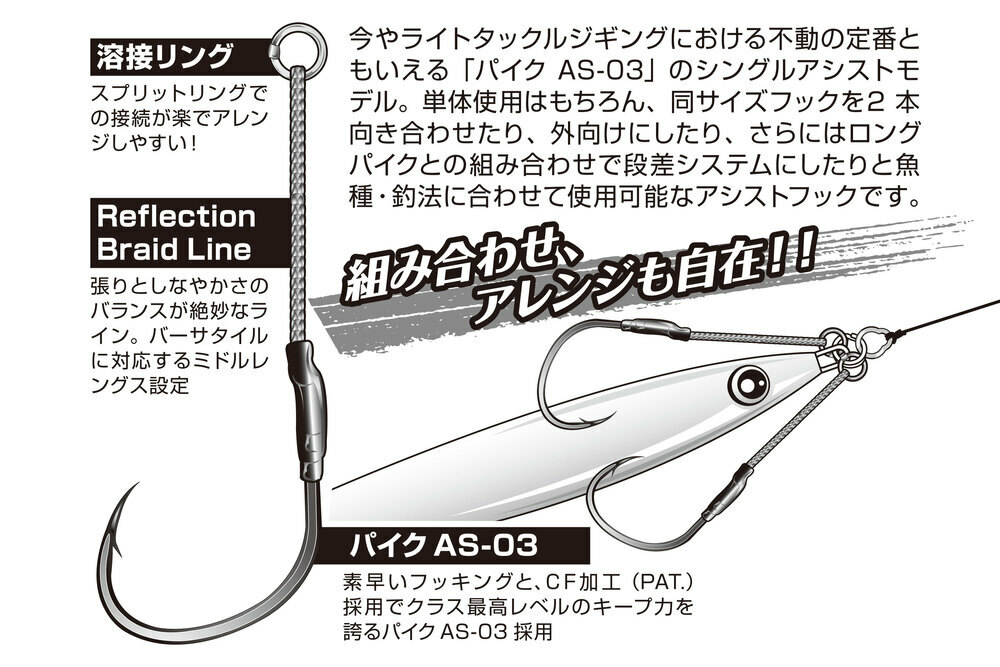 不論是岸拋輕鐵板或是船釣輕鐵板皆適用的款式,適用在中等尺寸的鐵板或是鎢鋼鐵板
