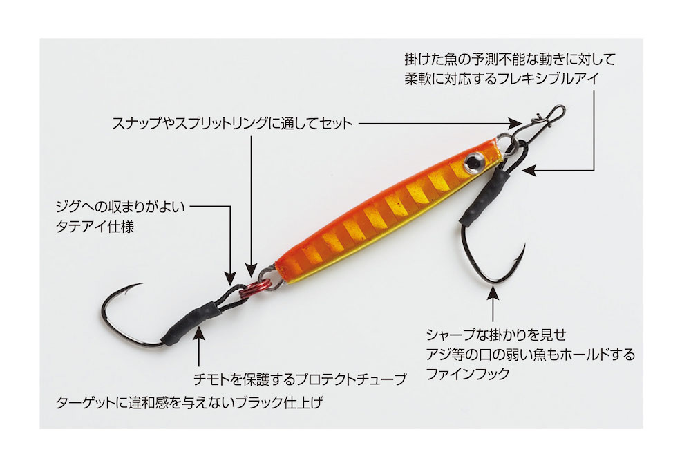 A hook for small jigs that supports metal jigs of about 2 to 10g. The short & vertical design is designed to fit into a jig. The front set can be used as an assist, and the rear hook can be set as a main hook. Since it has excellent snaglessness and holdability, it can capture the bottom without fear of rooting and reduce burr. It also supports rockfish and horse mackerel, such as rockfish, and small migratory fish (wakashi, shio, etc.).