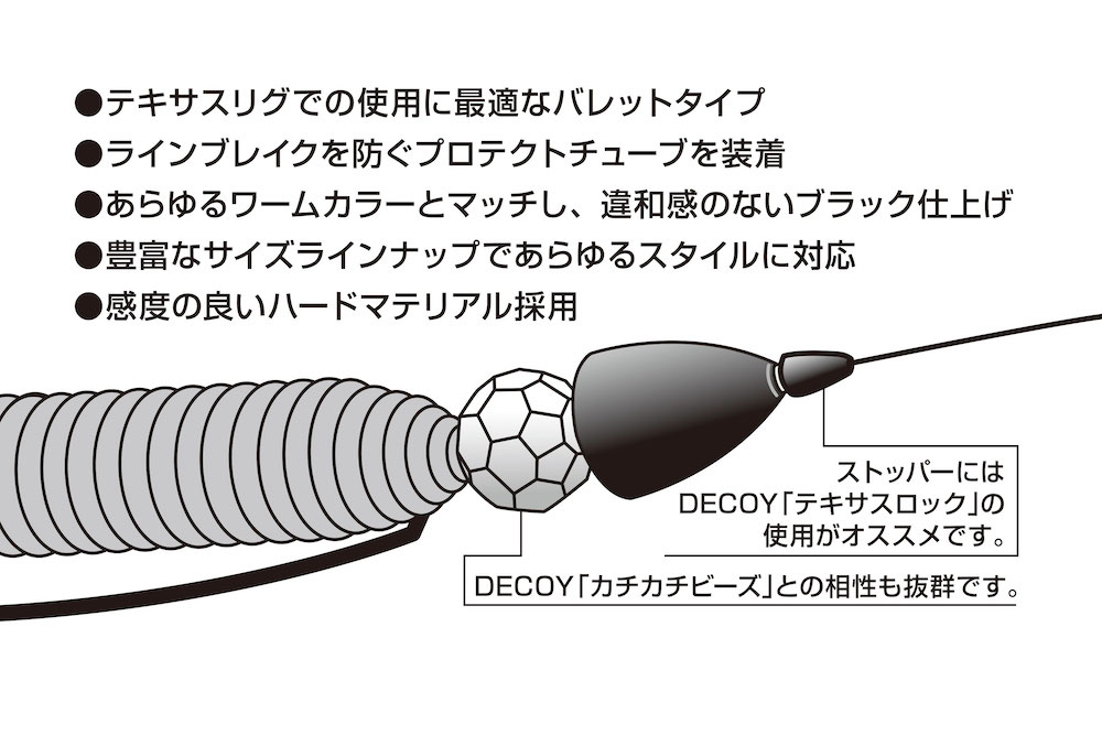It is a standard bullet sinker that matches basic rigs such as Texas rigs and Carolina rigs. A protection tube is attached to the through hole to prevent line breaks. Appearance is usually considered small details.