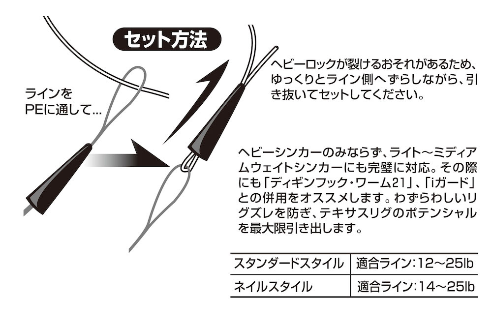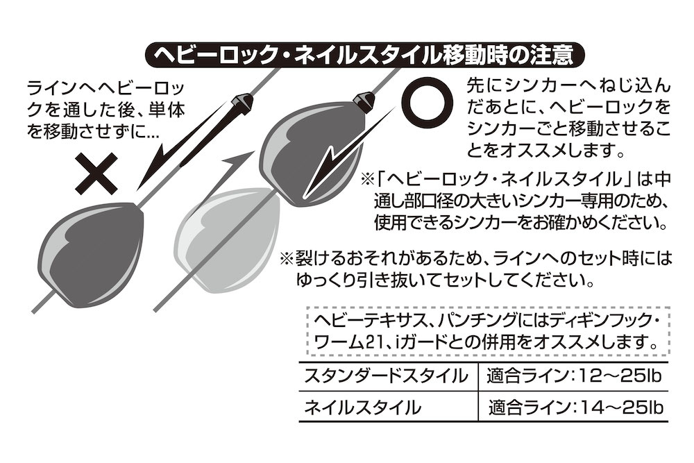 In heavy sinker Texas exceeding 1 oz, when a stopper rubber such as Texas rock is set, the weight of the stopper definitely causes the lock displacement due to the sinker load at the time of casting etc. "Heavy Rock" is a Texas rocker compatible with heavy sinkers that solves such problems. A lineup of two models that can be used depending on the sinker shape, the "standard style" that supports all weight sizes with a small through hole and the "nail style" that supports a large diameter heavy sinker.