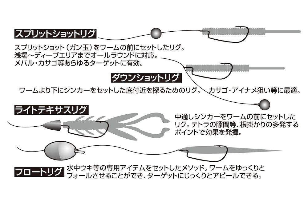 This is the minimum offset hook for split rigs, down shot rigs, and light Texas rigs of micro worms often used in rockfish games. It is recommended for use in float rigs that use underwater uki, etc. because they can capture rocky areas and seaweed beds without stress.