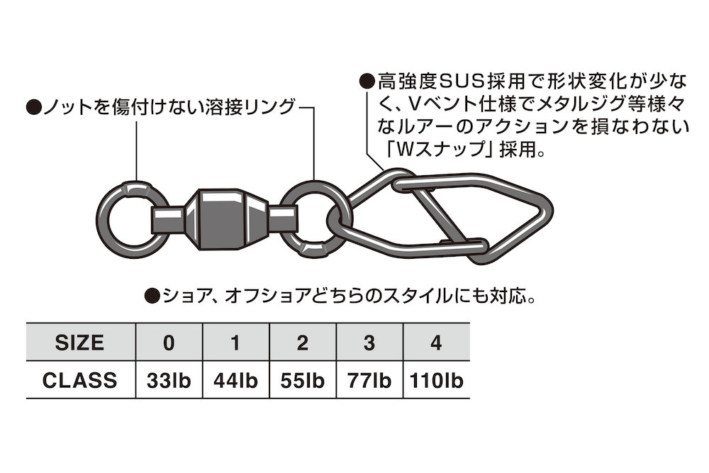 The SN-6 W snap is set on the high-strength, high-revolution ball-bearing swivel that prevents line troubles. Ideal for rotating lures such as metal jigs and spoons for swimming. NS black finish makes it inconspicuous. Of course, it supports both shore and offshore styles.