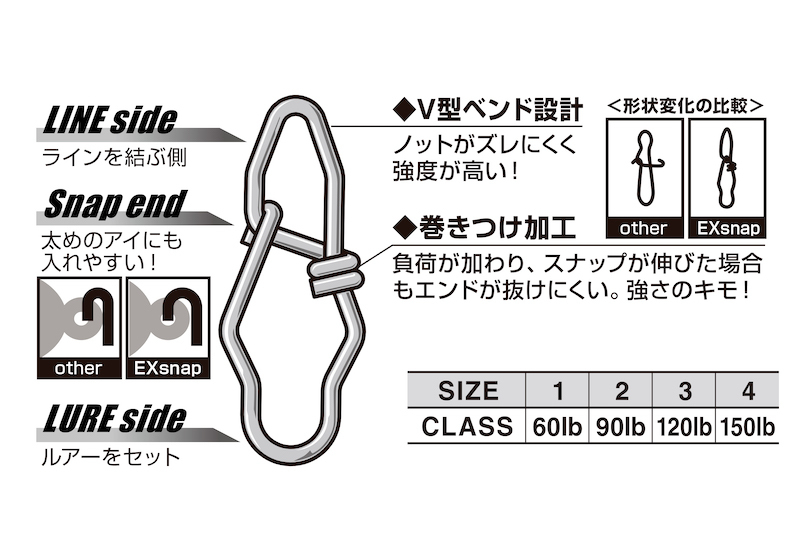 High-strength high-grade SUS wire is V-shaped and wound around the end to stretch the entire body when excessive force is applied, and a highly durable snap designed to avoid the worst situations such as pulling out or breaking. is.