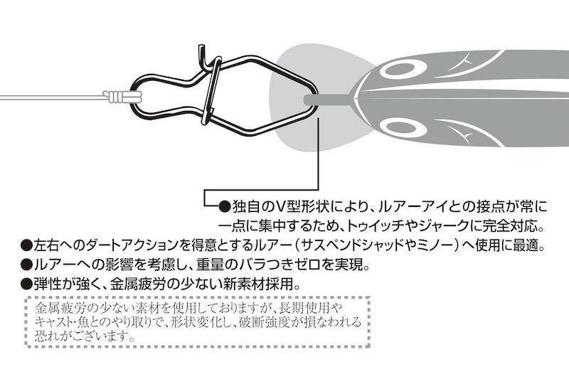 ● Due to the unique V-shape, the contact points with the lure eye are always concentrated at one point, so it is fully compatible with twitch and jerk.