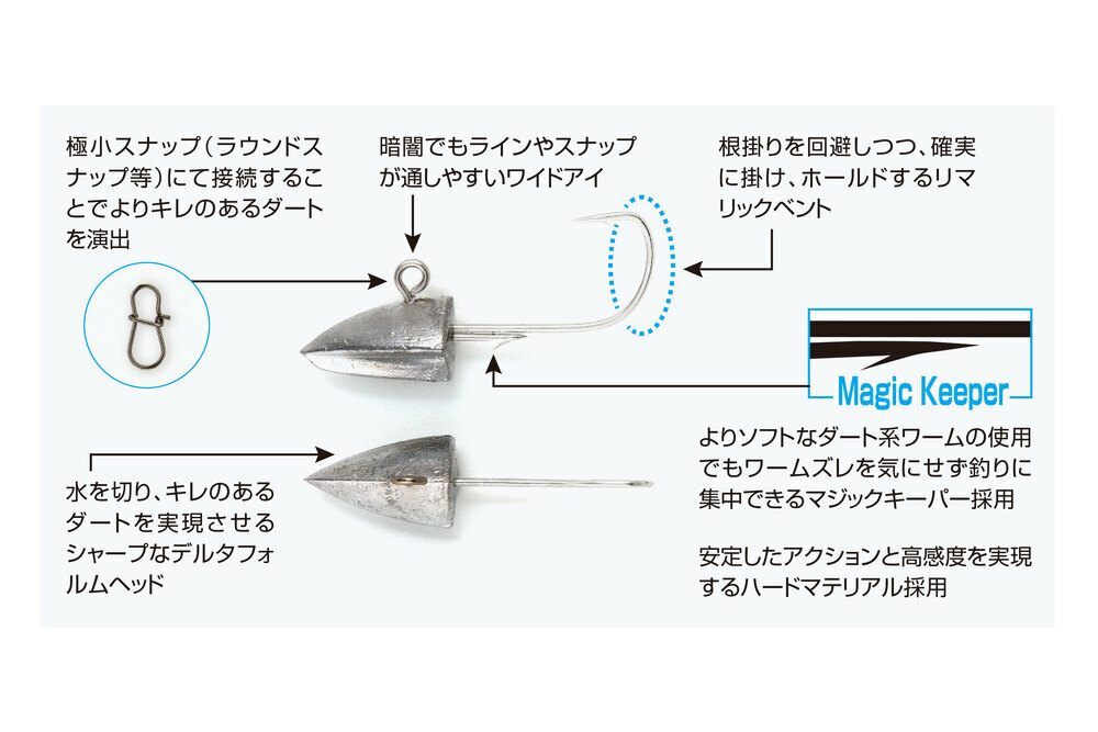 Magic Keeper設計, 預防軟蟲的鬆動, 針對纖細的軟蟲, 不會產生破壞, 不會因為Keeper造成軟蟲身體的腫脹, 影響到泳姿, 三角形造型的頭部不同於一般的汲頭鈎, 較好的切水性, 好產生急轉的動作
