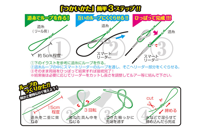 The leader ran out even though I was fishing in front of me! In such a case, the PE braided loop specification "smart leader" is useful. It is ideal for beginners as there is no need to build a leader system with a simple loop-to-loop connection that creates a loop on the road thread and passes it through it! Of course, the leader uses the fluorocarbon line to play an active part in various salt lure games such as egging and light shore jigging, and speedy leader exchange will not miss a chance time.