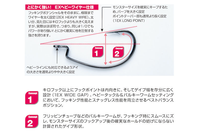 With the increase in average size, which is said to be caused by the decrease in the number of individuals, the approach with heavy tackles is becoming a matter of course. "Kilo Hyper Worm 13" is not defeated by EX heavy tackles such as flippin rod & 25 pound fluoro line, and thoroughly pursues from wire selection to shape balance that brings out performance with the concept of hook that is not comparable to beast bass. An EX heavy offset hook that supports styles that transcend power fishing, such as cover fishing with 1 ounce class heavy Texas rigs using bulky worms such as flippin tubes.