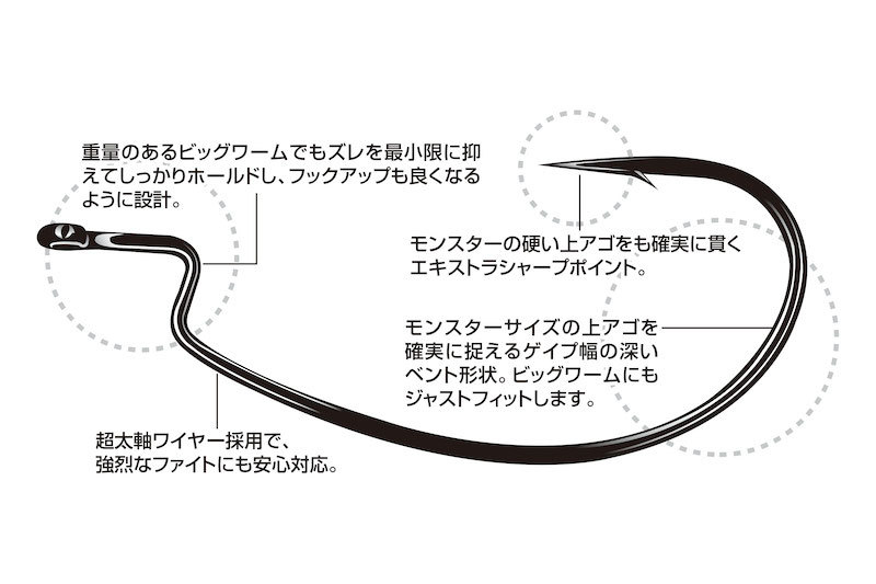 A monster-only hook aimed at Gomaru, Rokumaru, and Nanamaru sizes. Even if you use Dodekaworm, it will surely punch out the thick jaw of the monster. There is no problem with power by using an ultra-thick shaft wire. Don't worry about communication. The balance between the length to the first crank and the shape of the crank, taking into consideration the displacement of the worm and the elongation of the hook. It features a bent shape that allows the worm to slip smoothly when hooking and bring it into hooking. It is also ideal for swimbait big worms.