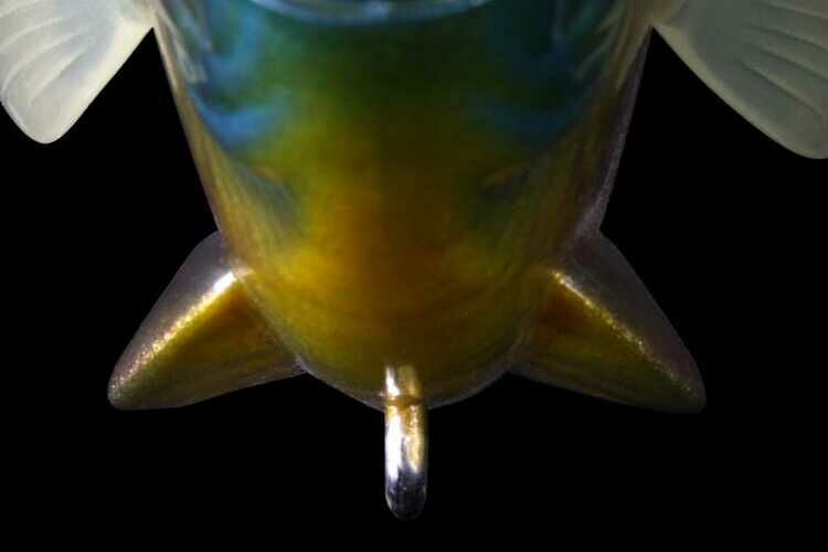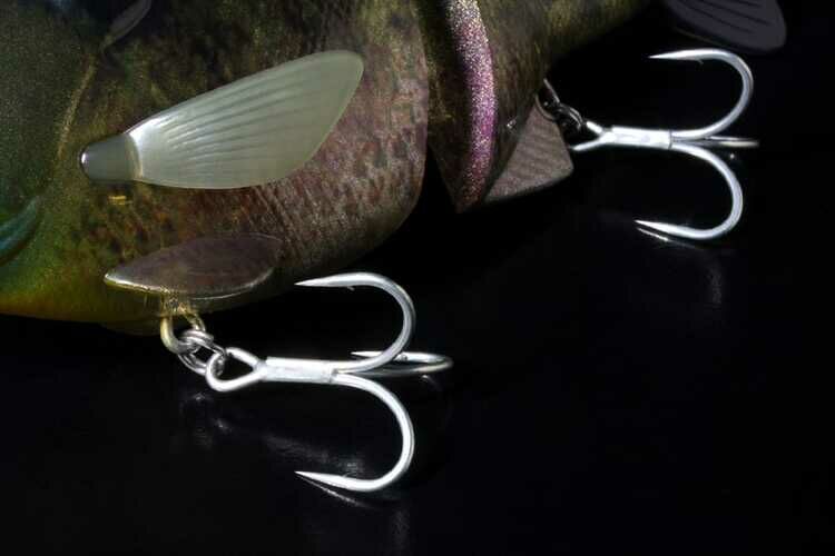 The ventral fins on the front hook, which are like horizontal stabilizers, not only prevent the hook from getting tangled, but also play a role in sharp twitch and jerk actions.