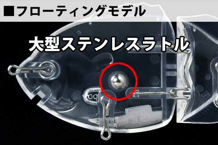 The front body is also equipped with a large 9mm stainless steel rattle, and the rattle sound that resonates just by swaying and drifting with the waves reminds you of a gizzard shad on the surface of the water, inducing a bite.
