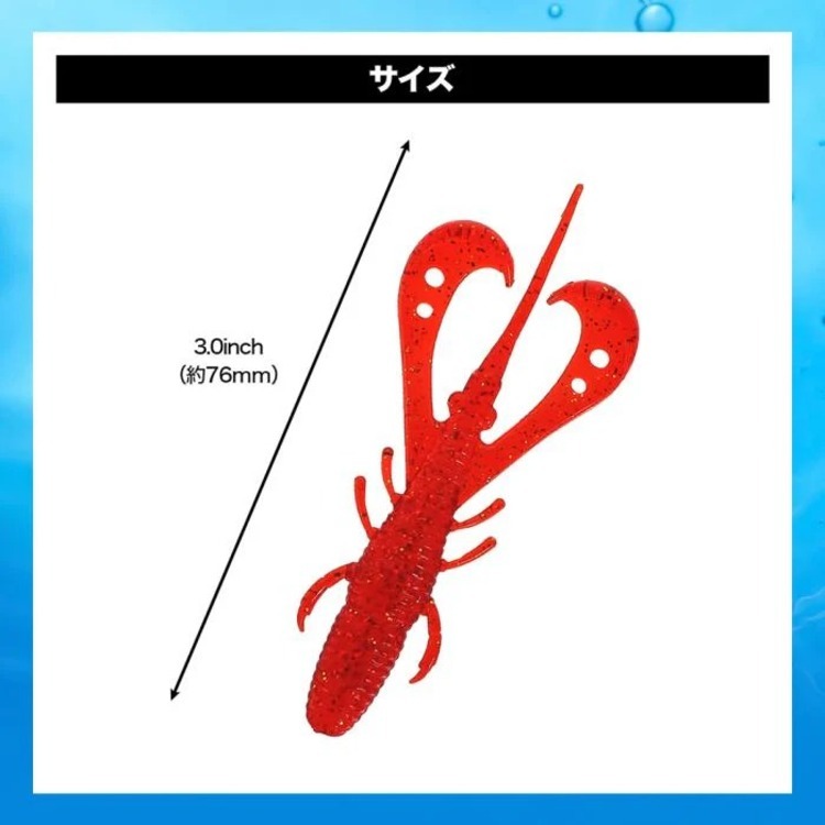 This soft bait is designed with actions and vibrations that appeal to target species. During slow retrieves, its six legs and pin tail generate subtle micro-vibrations for a natural appeal. When used with lift & fall or swimming techniques, the two large arms catch the water flow firmly, flapping up and down in sync with the pin tail, creating strong vibrations that attract fish across a wide area.
