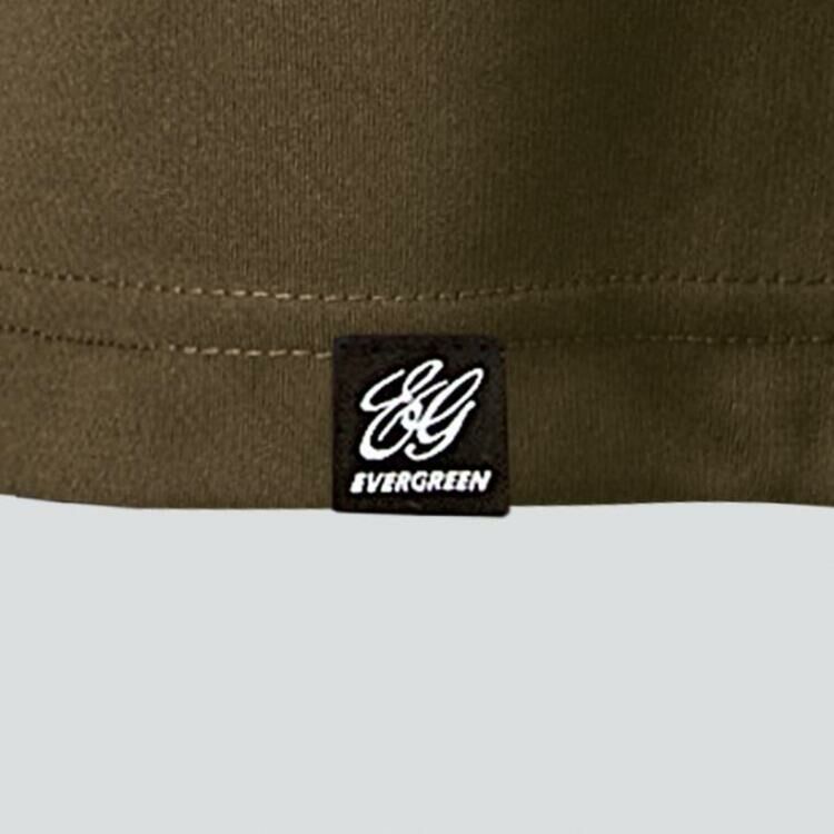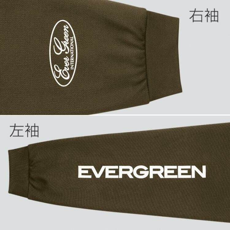 A different evergreen logo is printed on the left and right sleeves.