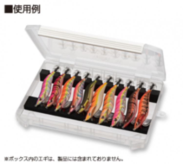 The low-resilience urethane gently holds the squid jigs. The unique slit shape allows for quick storage and removal. The standard type can store up to 10 squid jigs up to size 4 vertically.