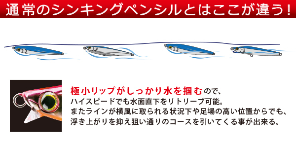 Since the extremely small lip grips the water firmly, it is possible to retrieve just below the water surface even at high speed.