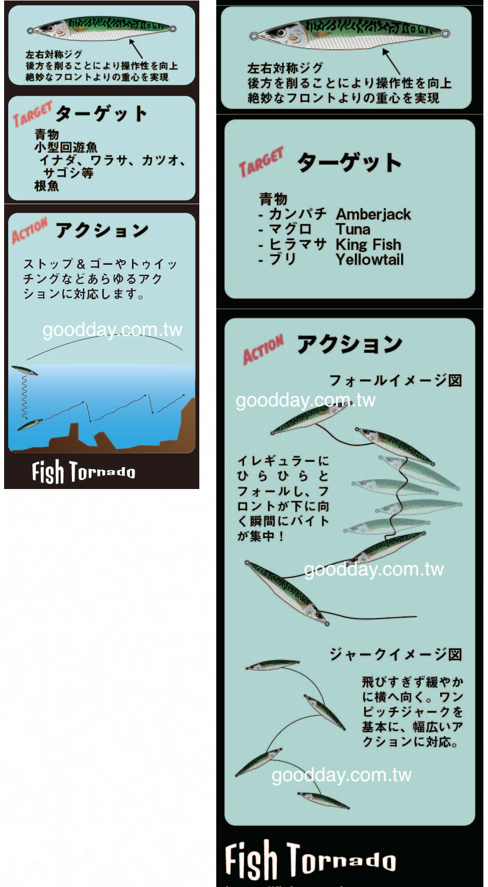 “Real Mackerel” fishes well on both slow and fast jigging cadences. It goes side to side minimum jerking effort and also good falling slides when its stopping. The hand pasting hologram has good fishing appeal for big fish like Tuna, Kingfish, Amberjack, King Mackerel...etc. Rigged with Decoy JS-3 assist on the nose and a Decoy JS-1 inline jigging single on the tail end these are ready to be fished straight out of the package. The realistic finish makes this a great option for a wide variety of bottom dwelling and pelagic species of gamefish.