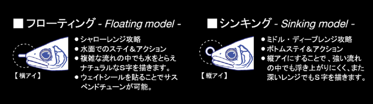 ○ Vertical eye makes it difficult to float up even in strong currents and draws an S-shape even in deep ranges.