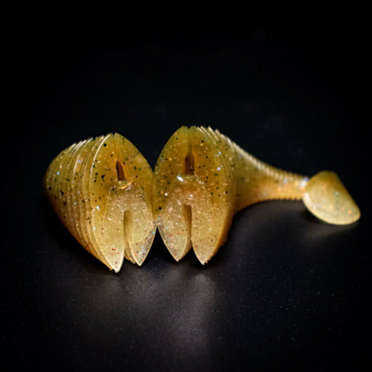 A new type has been added to the Bellows series! Its name is the Bellows Gill Swimmer. This Bellows has a vertical shad tail shape. The core axis has a low center of gravity, ensuring a stable swimming posture. The deep ribs are also a feature of the Bellows! The entire body is ribbed, so when a fish puts it in its mouth, it sucks it in all the way without any discomfort. In addition, the entire body is ribbed, giving it the strongest water bite, solid vibrations, and natural action.