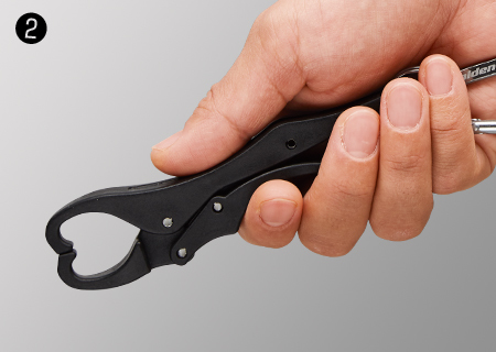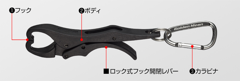 The "GM Light Grip", a compact fish grip for light game fish such as small migratory fish and rockfish, can easily hold the mouth of the fish with a locking hook opening / closing lever.