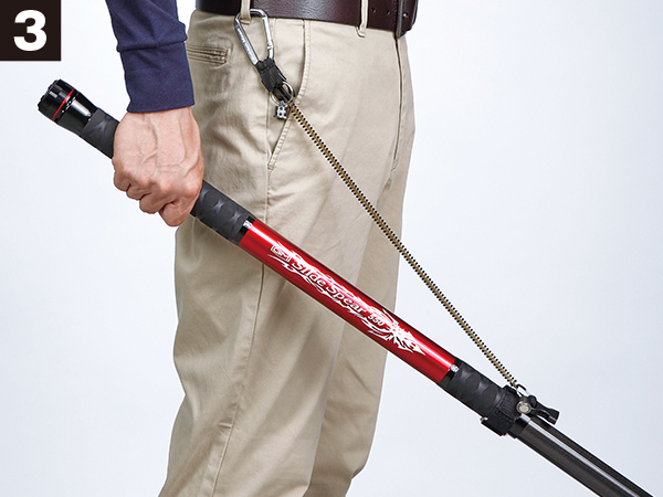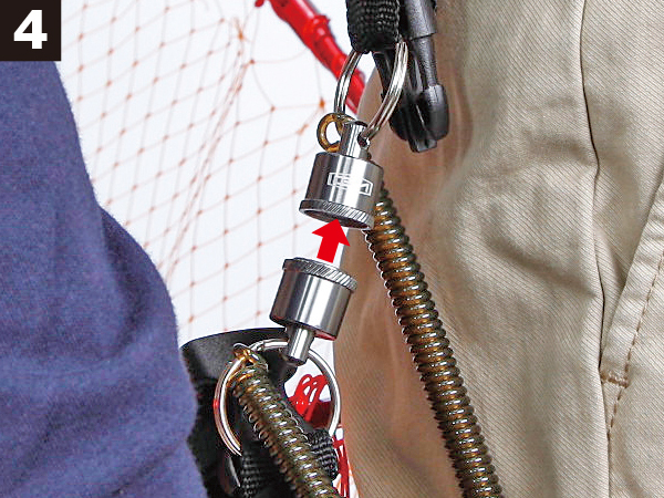 Attach the hook-and-loop fastener band to the net (Tamano pattern), and attach the carabiner to your favorite place such as the D tube or belt loop. During normal operation (during movement or storage other than actual fishing), connect both the main buckle and the magnet buckle to prevent accidental dropping or trouble.