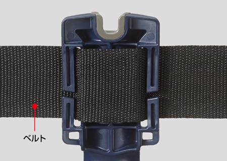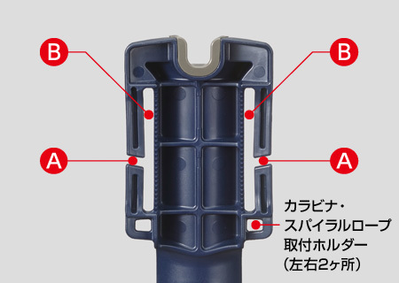 Insert the belt through the horizontal groove (A) of the belt attachment on the back side of the GM rod post DX body, and pass the belt completely through the vertical groove (B) to complete the installation.