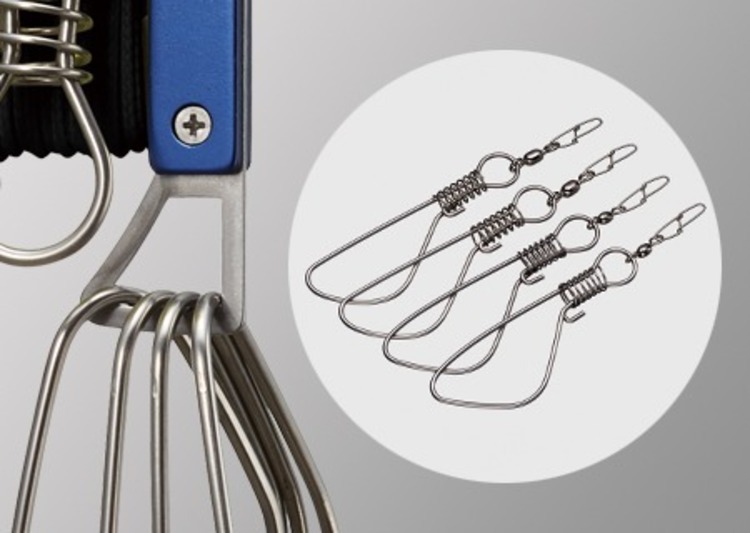 Built-in holder for spare hooks. Includes 4 additional snap hooks, enabling multiple fish to be kept at once.