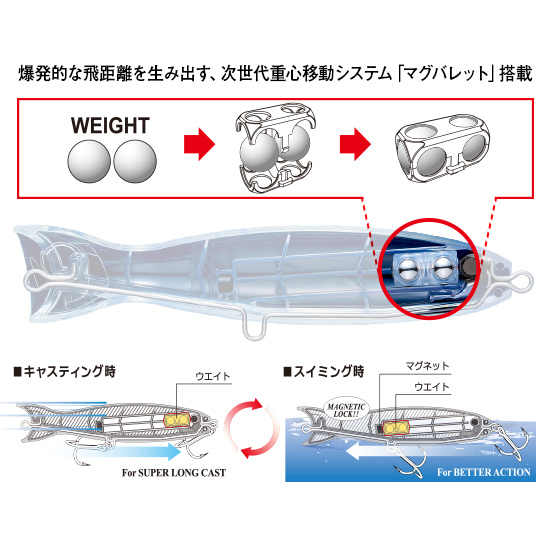 A weight ball that moves as a single mass is securely fixed with a strong magnet on the abdomen. Eliminates variation in the center of gravity and exhibits stable swimming performance.