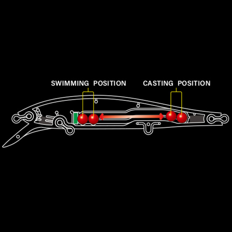Duel's original center-of-gravity movement mechanism that combines the advantages of a fixed center of gravity that provides high action response and stable swimming performance with center-of-gravity movement that promises overwhelming flight distance and casting accuracy with a 20% increase in magnetic force.