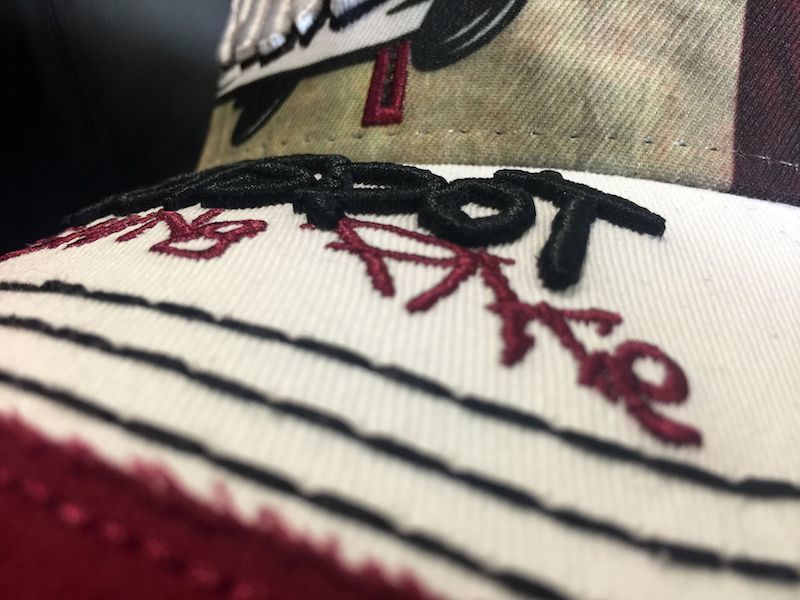 Visor:  in the center of the visor there is a red patch with distressed borders, text “Hotspot” realized in 3d embroidery, text “Fishing Pike” in flat embroidery, visor sewing lines are well visible and realized in contrast color (black sewing lines).