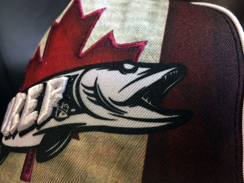 Cap front:  text “PIKER” realized in 3d embroidery, all the front panel has been printed with the Canadian flag using a vintage effect, the maple leaf of the flag has a red embroidered border in all the perimeter.