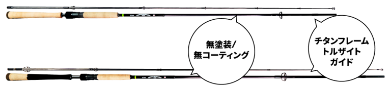 COWABUNGA!! 有趣的地方在於,它雖然採用了低彈性碳纖維,但在低負荷時依然保持挺拔,這得益於它的無塗裝、無額外塗層設計,以及超輕量鈦框 Torzite(托賽特)導環的應用。這樣的設計讓釣竿能夠精準傳遞來自魚的咬訊與水下路亞的細微動作,提升對小型震動的感知能力。此外,在進行Twitching(抽動)、操控細微動作時,也能提供更高的操作性。