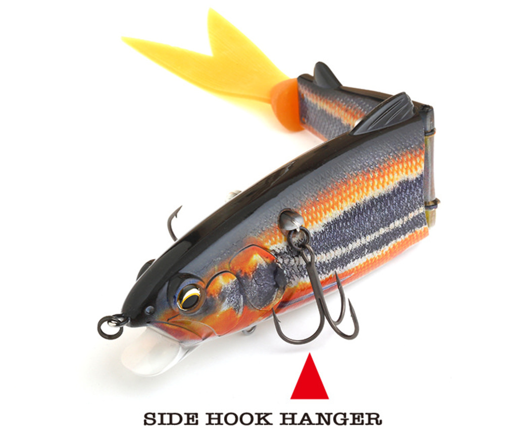 The side hook hanger is located on the side of the body, so it blends into the body and the bass is less aware of the presence of the hook. In addition, since it is hung in a free state, it is easy to be sucked into the mouth, and there is a high probability of a strong hook even with a threatening bite. In addition, the attachment position is installed slightly behind the head, which is the most aggressive target of the bass.