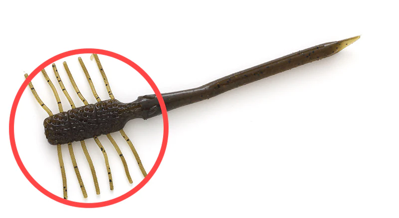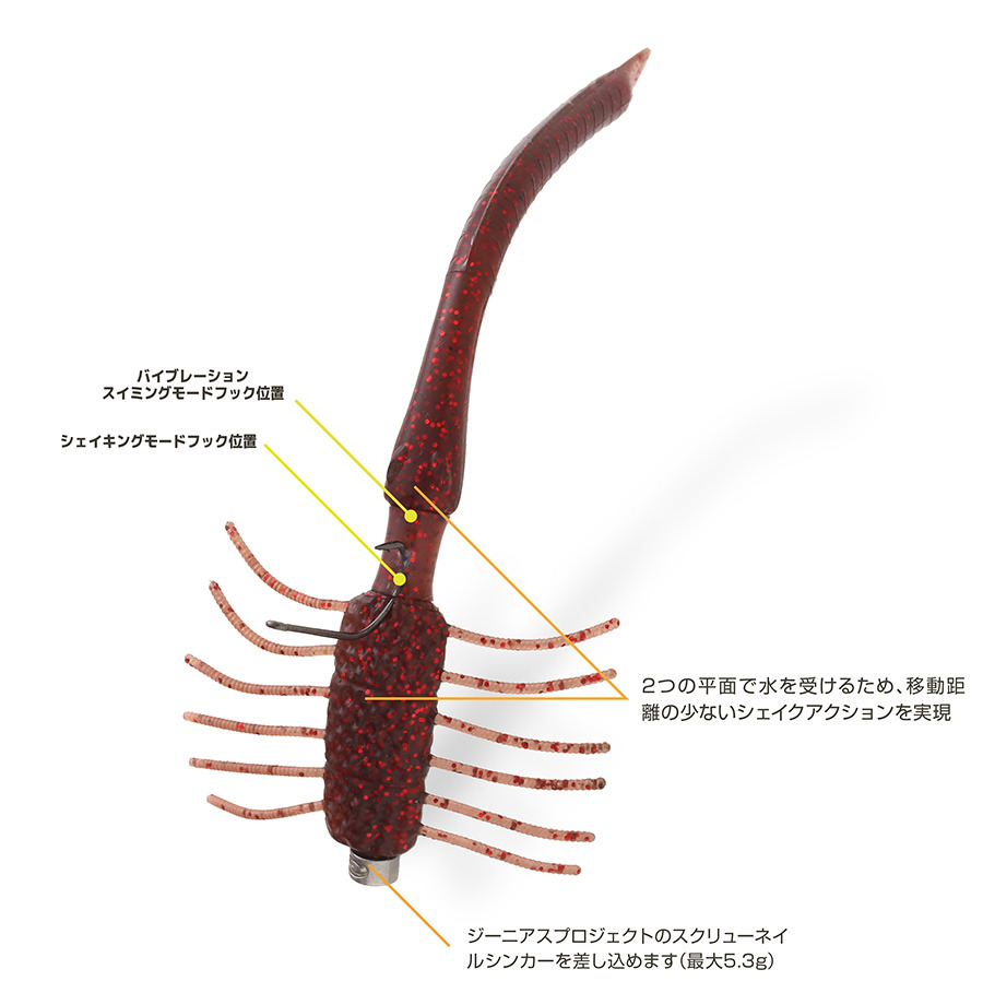 The Wriggler is set up for optimal shaking by inserting the hook from the head to the segment section. Alternatively, by inserting the hook into the segment and exiting through the tail, it can be used for swimming. Simply reeling it in will cause the entire body to vibrate, creating an appearance of a creature that bass have never seen before.